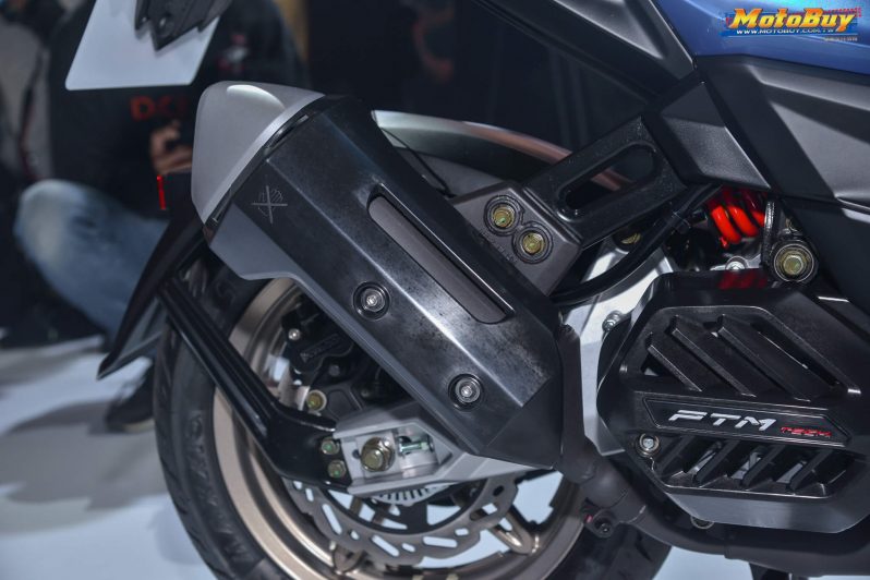 Kemudian belt pengerak dipilih untuk meneruskan power dari mesin ke roda belakang. Dan yang menarik lagi suspensinya, dia seperti motor sport. Mono suspension with horizontal backlink yang diwariskan dari AK550.