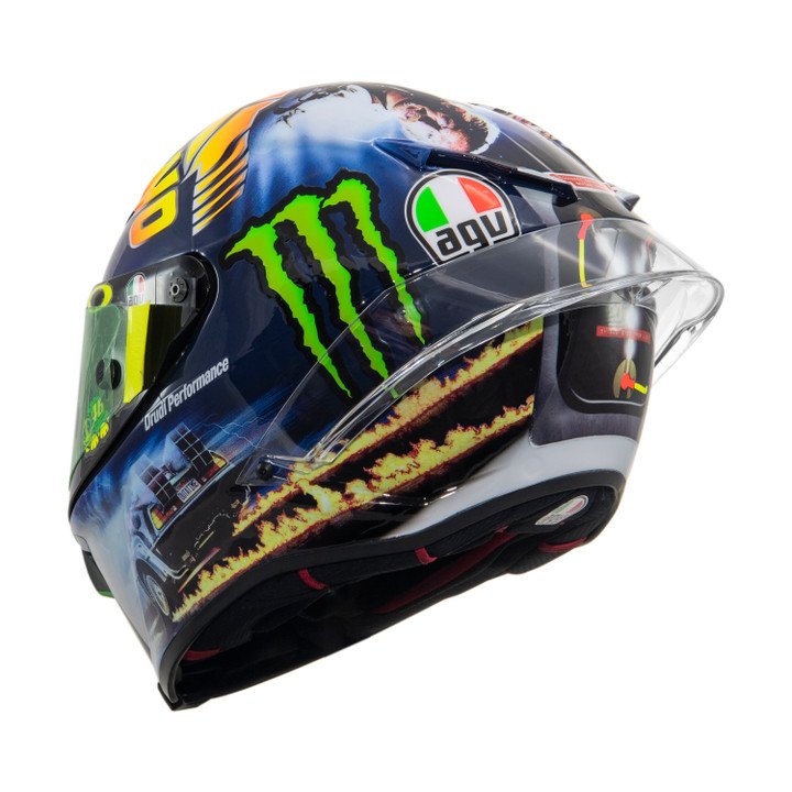 Kemudian soal desain AGV Pista GP-R Valentino Rossi “Back To Misano” 2018, ternyata terinspirasi dari film bioskop Back To The Future yang diperankan oleh J.Fox. Makanya dibagian samping terdapat mobil penjelajah waktu beserta angka berwarna warni. Selain itu, dibagian atas terdapat gambar Rossi sedang melihat jam dan disampingnya ada Christopher lloyd yang juga pemain Back To The Future.