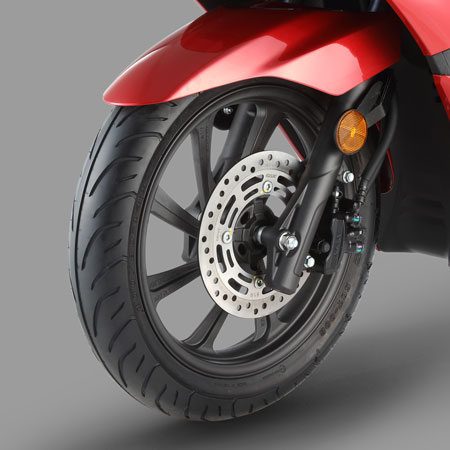| Tyres | Front : 100/80 – 14 M/C (48P) Rear : 120/70 – 14 M/C (61P) |