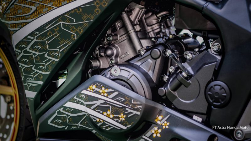 Garuda yang penuh wibawa tergambar pada striping di fairing sebalah kiri mewakili Indonesia. Selain itu kehadiran detail rantai dan piston dengan corak batik juga mewakili Indonesia.