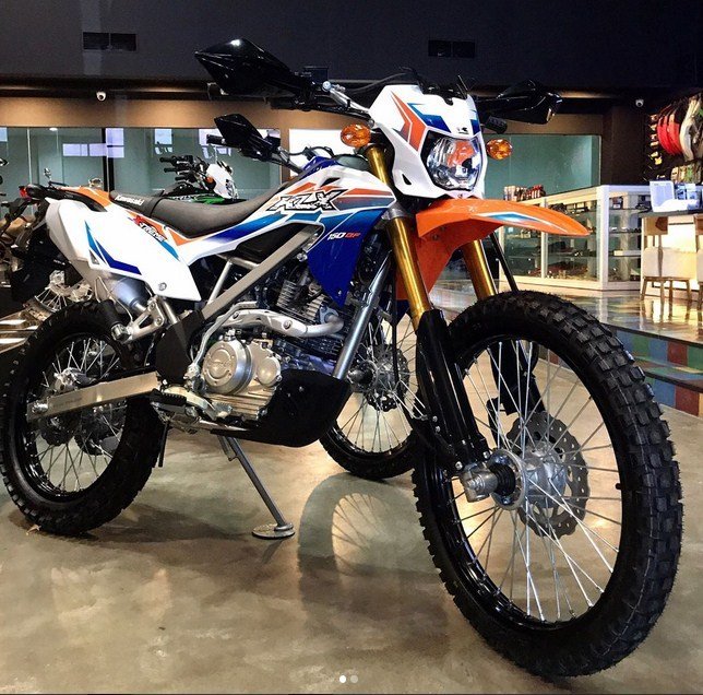 Jika KLX150BF SE (special edition) terdapat 3 pilihan warna yakni Hitam,Hijau dan kuning. Maka untuk Kawasaki KLX150BF Xtream ini hanya terdapat satu warna saja yakni putih. Eits,,tapi enggak putih biasa…akan tetapi putihnya itu sebagai warna dasar,nah pada sekujur bodynya disematkan striping berwarna biru dan orange.
