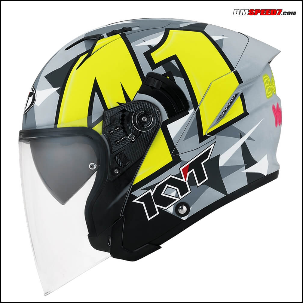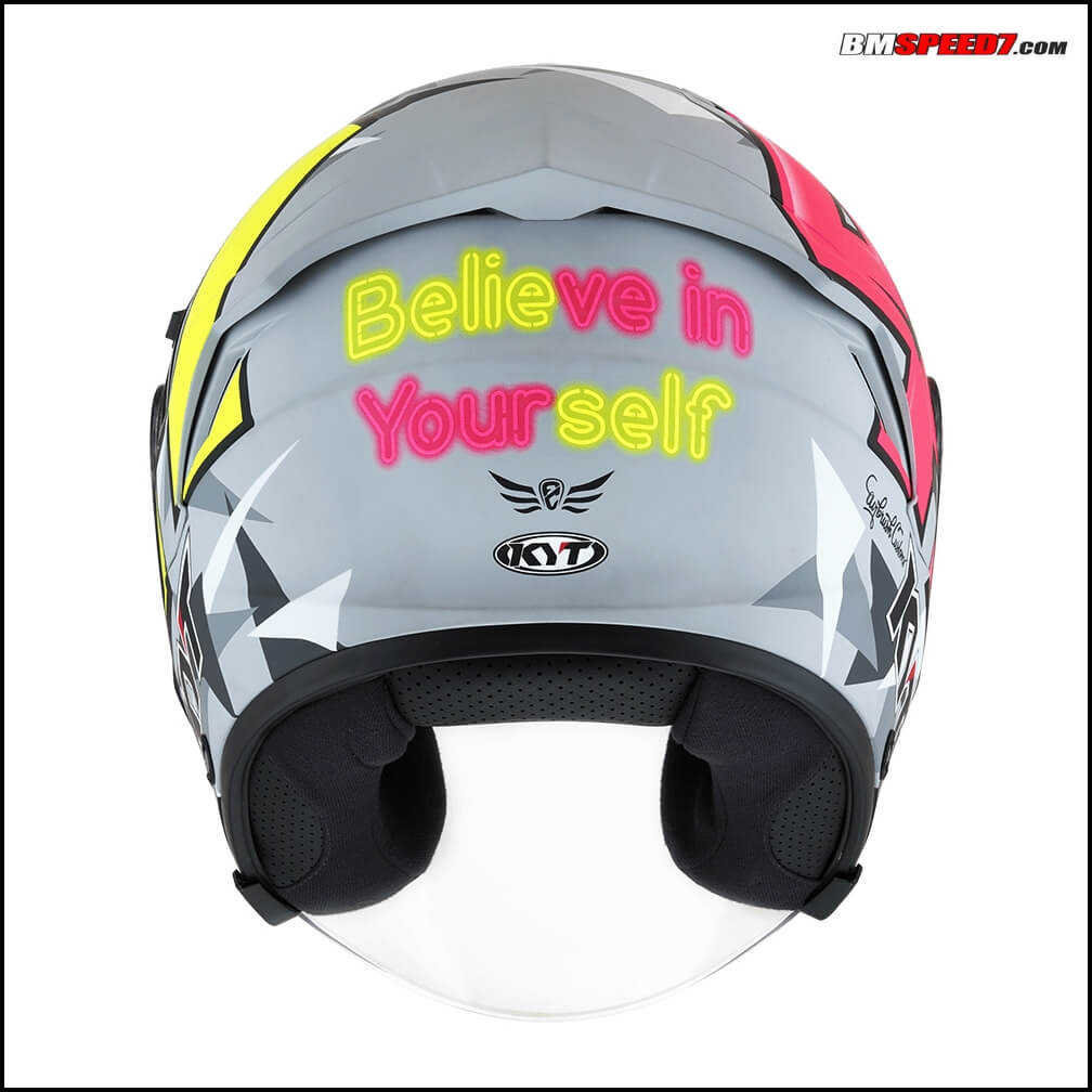 Warna dasar matte grey tersebut dikombinasikan dengan warna hitam dan putih sehinga membentuk motif yang keren. Tak lupa karena ini helm Aleix Espargro, maka terdapat ciri khasnya yakni nomor start 41 dan tulisan Believe in Your Self.